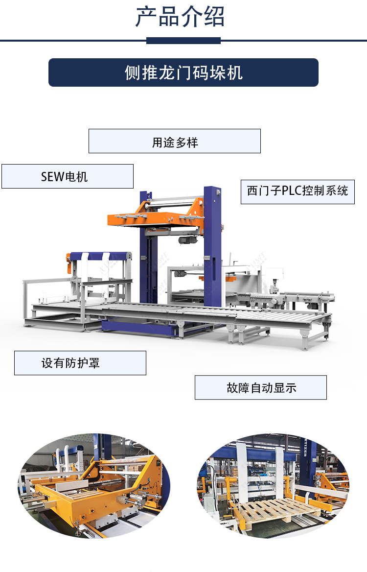 龍門側推碼垛機結構骨架為焊接結合方式,底座可調,主機升降臺采用SEW電機傳動,入口加速輸送帶將進箱分離,堆棧區動力滾筒輸送,2.5m長棧板輸出,自由輥筒輸送帶,周圍安全防護裝置,采用德國西門子PLC控制系統,可移動式人機接口,故障自動顯示。